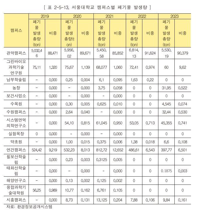 1-3-2. 폐기물 배출량 (출처: 서울대학교 2023년 ESG 보고서)
