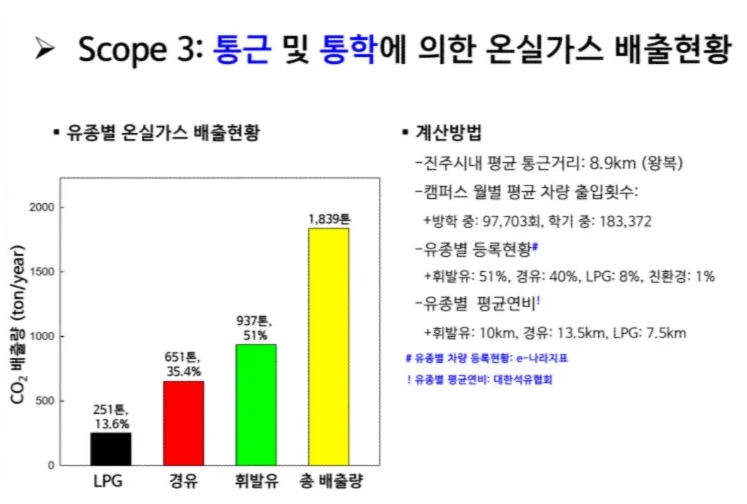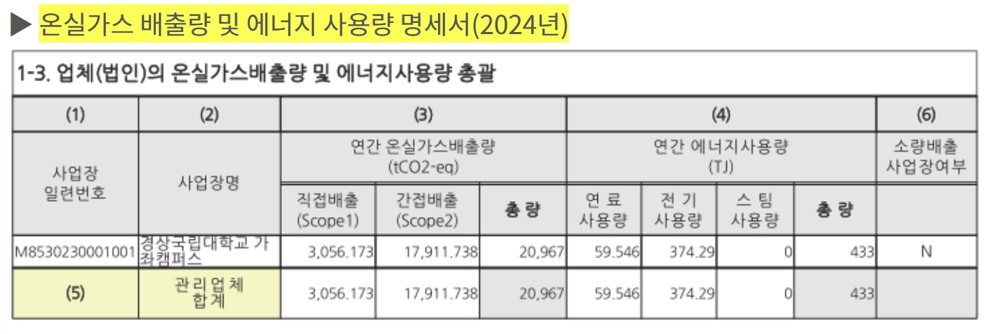 특히 주목할 만한 점은 대부분의 대학들이 Scope 1, 2만 관리하는 것과 달리, 경상국립대학교는 Scope 3까지 온실가스 배출량을 산정하여 공개하고 있다는 것입니다. 이는 직접 배출과 간접 배출뿐만 아니라 가치사슬 전반에 걸친 온실가스 배출에 대한 책임을 인식하고 있음을 보여줍니다.
