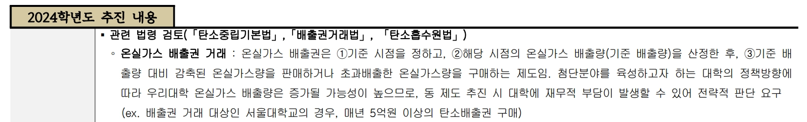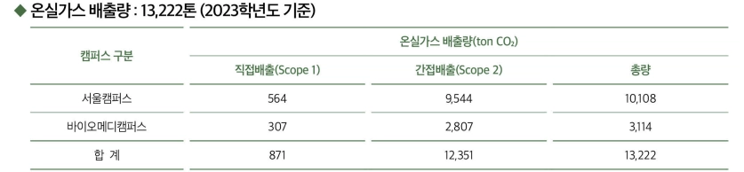 동국대학교는 2024년 지속가능경영보고서를 통해 온실가스 배출량을 월별로 공개하고 있으며, 배출권 거래제 시행 계획과 Scope 1, 2 구축 계획을 발표했습니다. 다만 Scope 3는 아직 계산하지 않는 상황입니다.